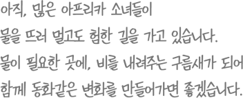 생명을 살리는 [신비의 물방울]은 깨끗한 물을 구하기 위해 매일 먼 길을 떠나는 여성과 소녀들의 이야기입니다.